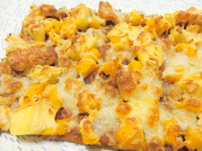 Repartiu el sofregit de tomata per la base de la coca, damunt, la cansalada, els daus de brie i els de carabassa.